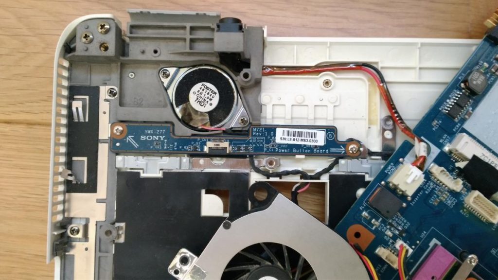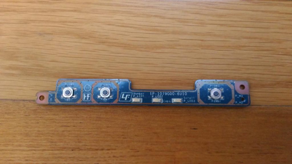 正常動作する方のパーツを問題のパソコンに付けてみると、原因がわかりました。電源を押すボタンの下の電源パネル基盤不良でした。このパネルはマザーボードとフラットケーブルでつながっています。正常な電源パネル基盤に取り換えて、ようやく修理完了しました。